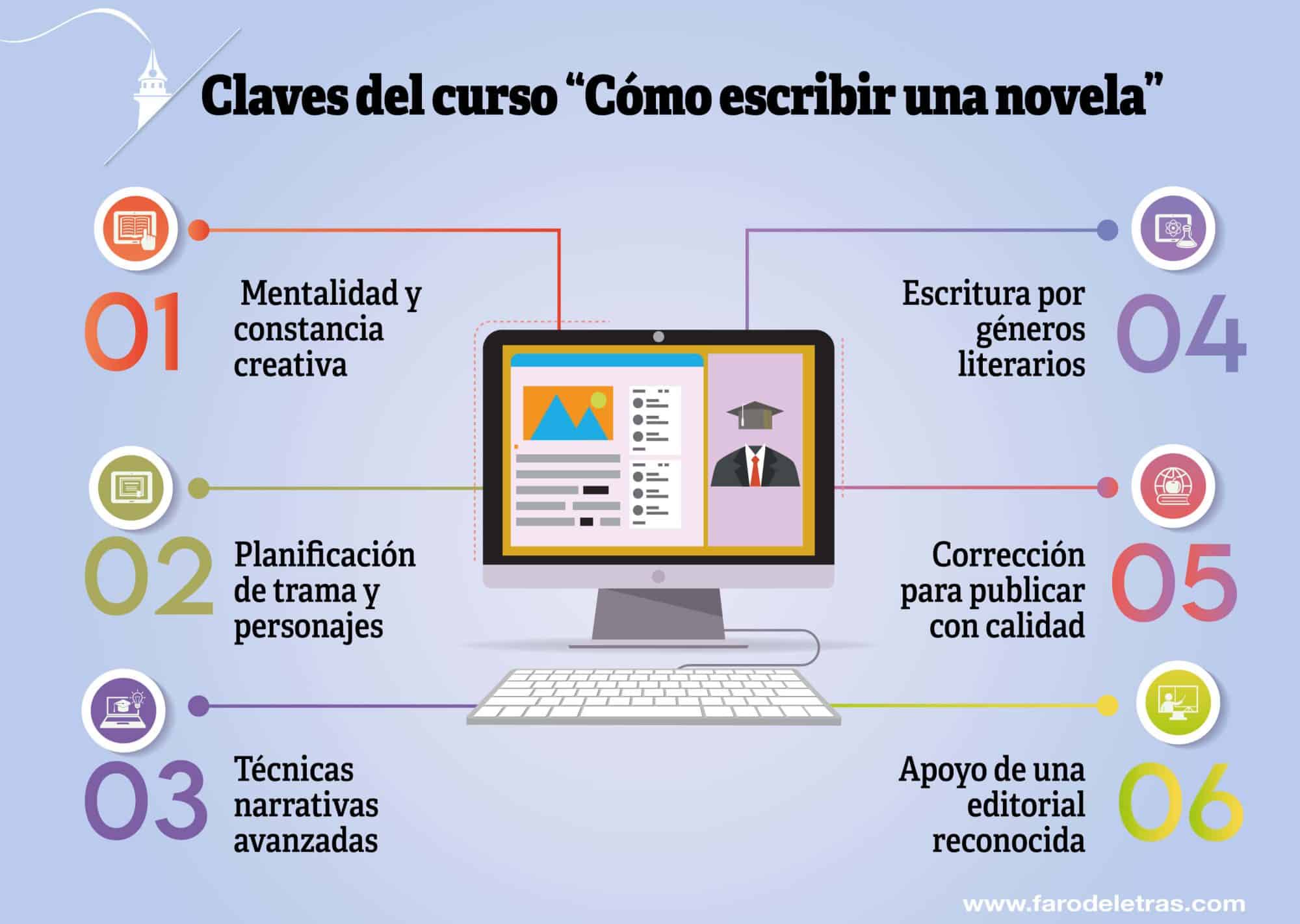 El curso está dividido en cinco módulos principales que cubren todo el proceso creativo y técnico que necesita dominar un novelista: